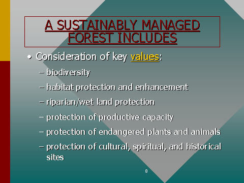 These values are examples of what one must consider in the practice of sustainable forestry.