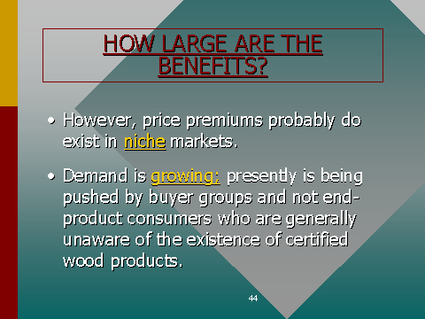 The general consensus is that demand for certified wood products will grow. This is based on high current demand for niche market wood products and the fact that Home Depot announced its intention to “eliminate wood from endangered areas -- including lauan, redwood and cedar products -- and give preference to certified wood” that is tracked from the forest to the customer. Home Depot appears to favor the FSC protocol at the present time.