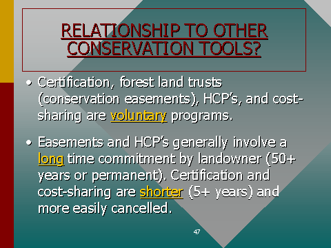 Conservation easements and HCP’s involve commitments over long time periods whereas forest certification and cost-share programs are effective over much shorter time periods.