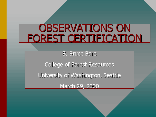 A brief tutorial for introducing forest certification. Discusses the pros/cons of certification as well as the relationship to other policy tools such as forest conservation easements, HCPs, cost sharing, forest practice regulations and tax incentives.
