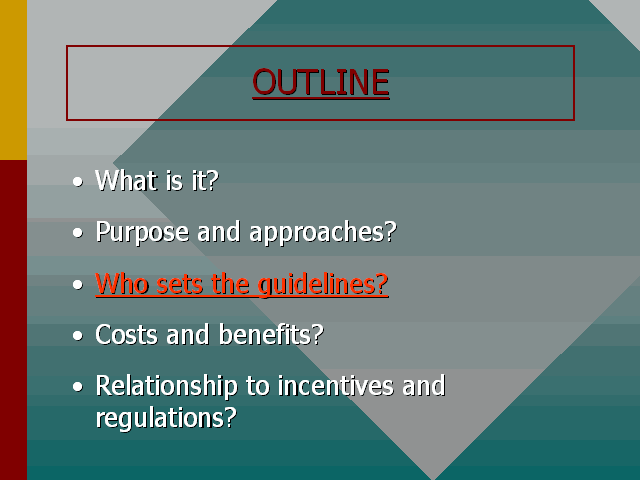 The next topic discusses who defines the certification guidelines, be they performance or management-system based.