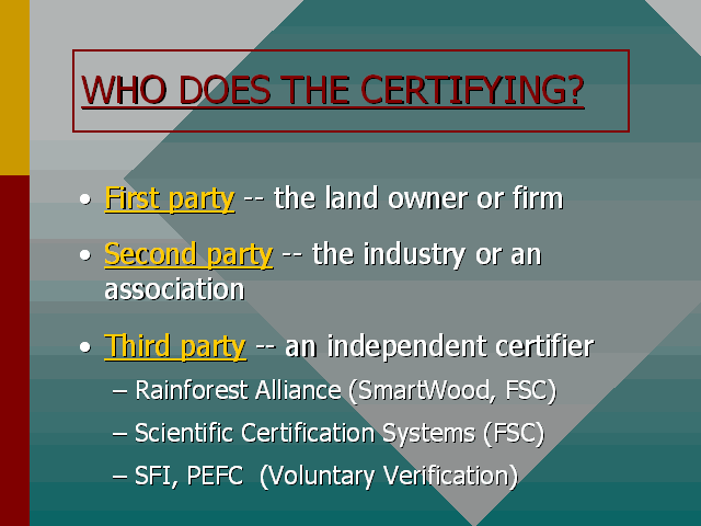 The Forest Stewardship Council’s certification program includes ten principles: #1-8 refer to the management of natural forests, #9 to the conversion of natural forests and #10 to plantation forests. FSC uses these principles to identify well managed forests and not sustainable forests. May create trade barriers as it seems to be biased against plantation forests in favor of natural forests. The Canadian Standards Association and the ISO 14001 standards were discussed on slide nine.