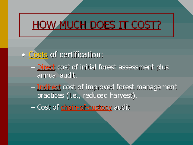 If chain-of-custody is desired, additional auditing costs are incurred. Costs of tagging forest products, keeping products segregated at various stages of production and marketing products are included in this activity.