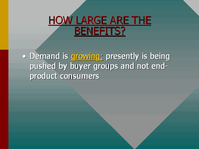 The general consensus is that demand for certified wood products will grow. This is based on high current demand for niche market wood products and the fact that Home Depot announced its intention to “eliminate wood from endangered areas -- including lauan, redwood and cedar products -- and give preference to certified wood” that is tracked from the forest to the customer.