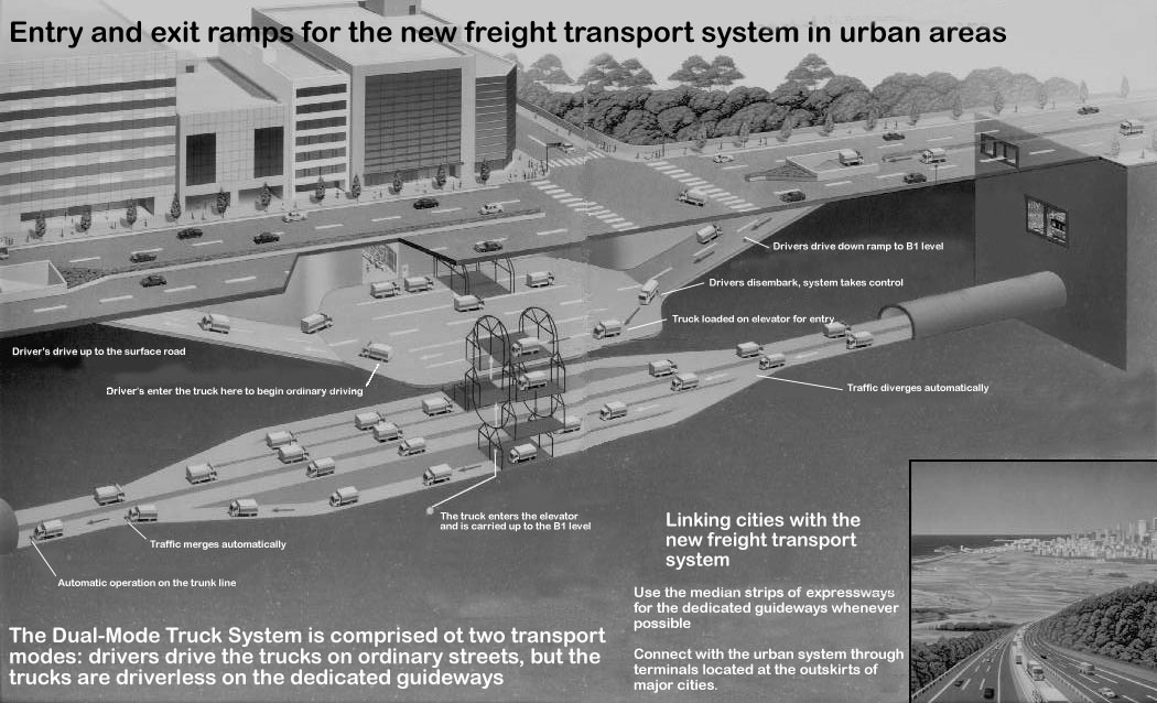 At the Public Works Research Institute, Advanced Transportation Division of the Ministry of Construction in Japan, work was done on the development of a new freight transport system. This information has been derived from a (probably 1992) paper that describes this work, but the date of the paper and its source are unknown. This new freight system has been proposed to resolve such issues as congestion, pollution and other negative impacts caused by trucks. In the proposed new freight system, dual mode trucks (DMT's) would be used that would work the same as a conventional truck on existing roads but can also be automatically operated (driverless) on special dedicated guideways (see overview sketch of the system).
