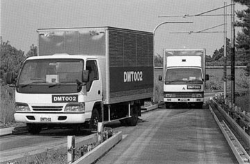 The Public Works Research Institute built a 760 meter dedicated track for testing the DMT's. The track was used for experiments to test, among other factors, computer-controlled operation, the communication system, automatic traffic divergence, automatic vehicle spacing and merge actions. The design speed for this test track was 40 km/hr and it included grades of +6% and -6% and curves with a radius of 65 meters. The DMT's used for testing were steered mechanically using a guide rail and guide apparatus (consisting of guide wheels and a stabilizer). This mechanism helped the vehicle run straight when the truck was moving along straight stretches of track and allowed it to hug the outer guide rail around curves. At forks, a guide wheel pushes against a guide rail on one side to permit the truck to accomplish switching. On ordinary roads, the guide wheels were retracted within the body width and the stabilizer was disengaged from the steering mechanism.