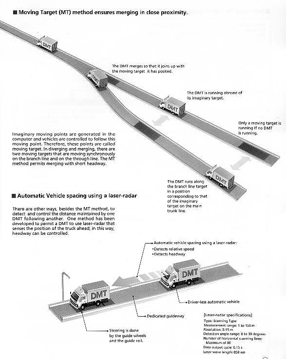 Imaginary moving points were generated in the computer and vehicles were controlled to follow this moving point. These moving points were called targets. In diverging and merging, there are two moving targets moving synchronously on the branch line and on the through line. The MT method permits merging with short headways. Other control methods were also investigated such as a laser-radar that could sense the position of the truck ahead (see diagram for more detail).