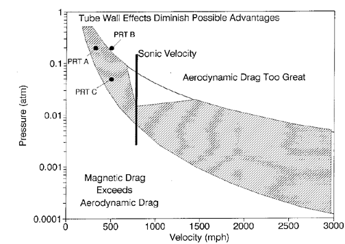 Figure 4: Feasible combinations of pressure and velocity for PRT maglev, which would offer reduced aerodynamic drag. On bottom of region magnetic drag is equal to aerodynamic drag