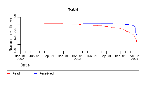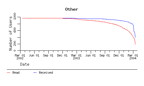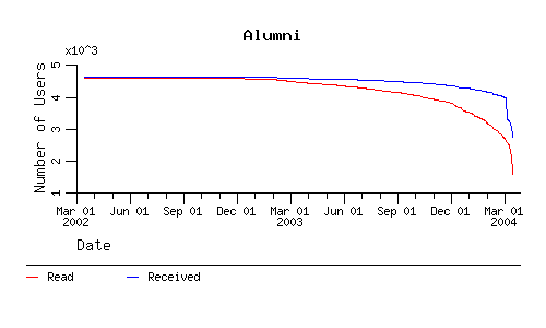 The following charts show the number of deskmail accounts that had INBOXes that have been read or have received new mail since the indicated time. Note that there is significant overlap in the different classes of users.