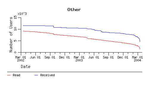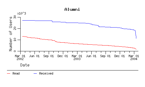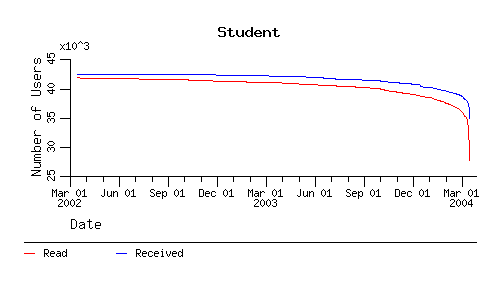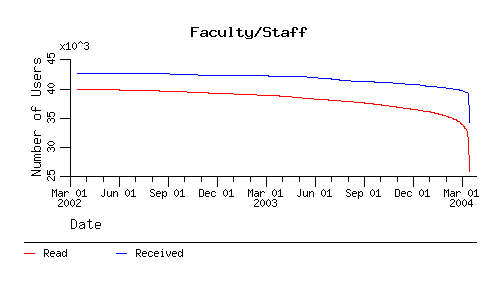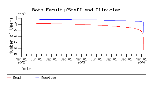 The following charts show the number of deskmail accounts that had INBOXes that have been read or have received new mail since the indicated time. Note that there is significant overlap in the different classes of users.