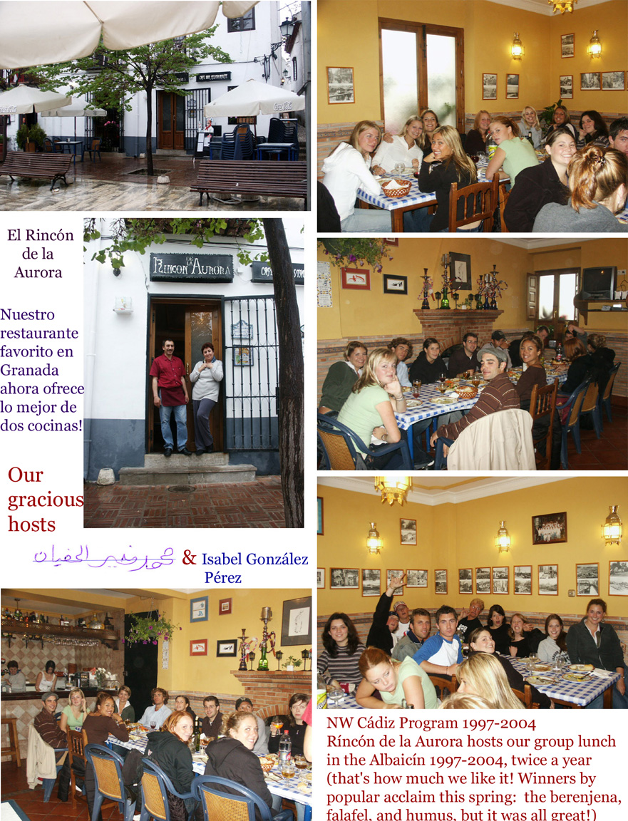 For our biannual visit to Granada we always try to have lunch at the Rincón. It was touch and go this spring because we couldn't reach anyone at the restaurant. Finally a friend-- the same Dr. who sewed up Alvorada, our student in the fall of 2001 after a nasty fall-- offered to walk to the Plaza and see if he could come up with a number. He did better than that, he made our reservation and then returned there for dinner with friends just to check it out. Just reopened two weeks ago under new management, this little spot on the Plaza San Miguel Bajo is perfect for our group lunch and with the expanded dining room facilities, it can now accomodate us indoors if need be (unfortunately, this was the case: it drizzled all day for the opening of La Cruz). The new manager, Mohamad, and his wife Isabel González, a former regular client and long time friend of Pepe, the owner, couldn't be more accomodating. The food was fantastic, as usual, but even more interesting this time since the menu now includes several really fantastic Middle Eastern dishes in addition to the traditional fare we've been enjoying there for the last 7 years (carne a la rondeña, pollo al ajillo, calamares, berenjena con miel, entre otros).