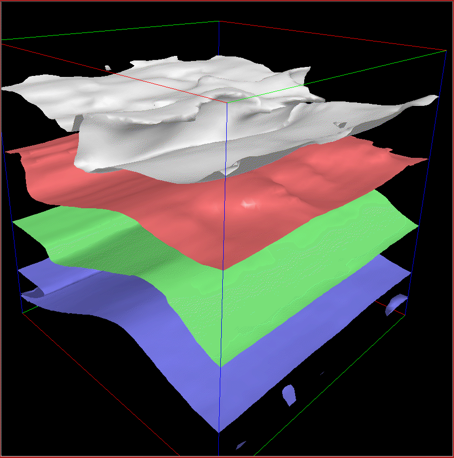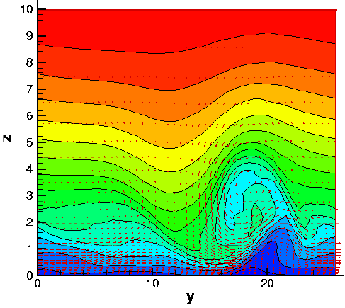 The first figure is taken from a simulation performed by Dr. Lombard of internal wave breakdown. Its shows the distortion of four different constant density surfaces just prior to breakdown of an internal wave into turbulence. (The wave is propagating from the bottom left to the upper right in the figure.) The second figure, from the thesis of Dr. Barnard, is an y-z cross section from a simulation of a very stable boundary layer showing a roll vortex that is transporting cooler air over warmer air. The fluid flow is indicated by the red vectors (somewhat difficult to see in this figure) while the colored contours show the temperature field. The resulting convective instability caused by cooler, more dense fluid overriding warmer, less dense fluid results in a breakdown of the vortex into turbulence. This mechanism may explain the development of sporadic and patchy turbulence in the very stable boundary layer.