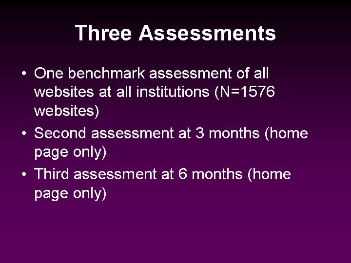 - One benchmark assessment of all websites at all institutions (N=1576 websites)