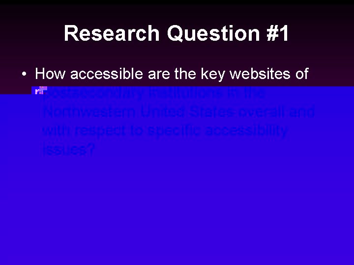 - How accessible are the key websites of postsecondary institutions in the Northwestern United States overall and with respect to specific accessibility issues?