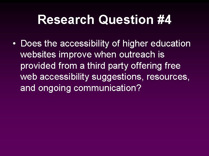 - Does the accessibility of higher education websites improve when outreach is provided from a third party offering free web accessibility suggestions, resources, and ongoing communication?