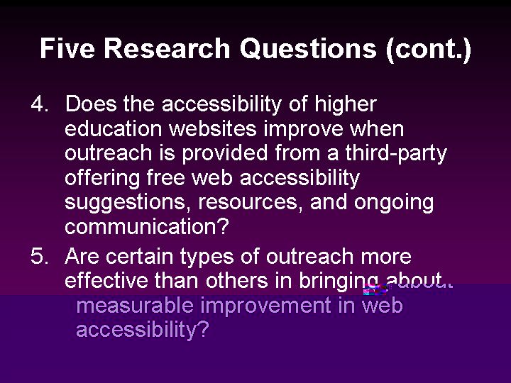 - Does the accessibility of higher education websites improve when outreach is provided from a third-party offering free web accessibility suggestions, resources, and ongoing communication?