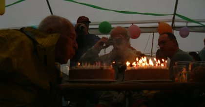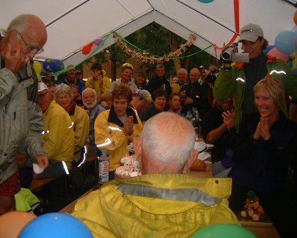 Our oldest male rider, Elbert, celebrated his 80th birthday today and we had a party after dinner. A collection was secretly taken to get him a new tent. A video was taped at dinner of all the entertainment and speeches made. Two cakes were loaded with candles for Elbert to blow out. All this took place under large tents in the rain. It was a touching moment for Elbert and his Odyssey family. He is an inspiration to all of us. He rides every day but doesn't always get to finish the miles. However, today he rode 80 miles and several fast riders rode with him to help him celebrate.