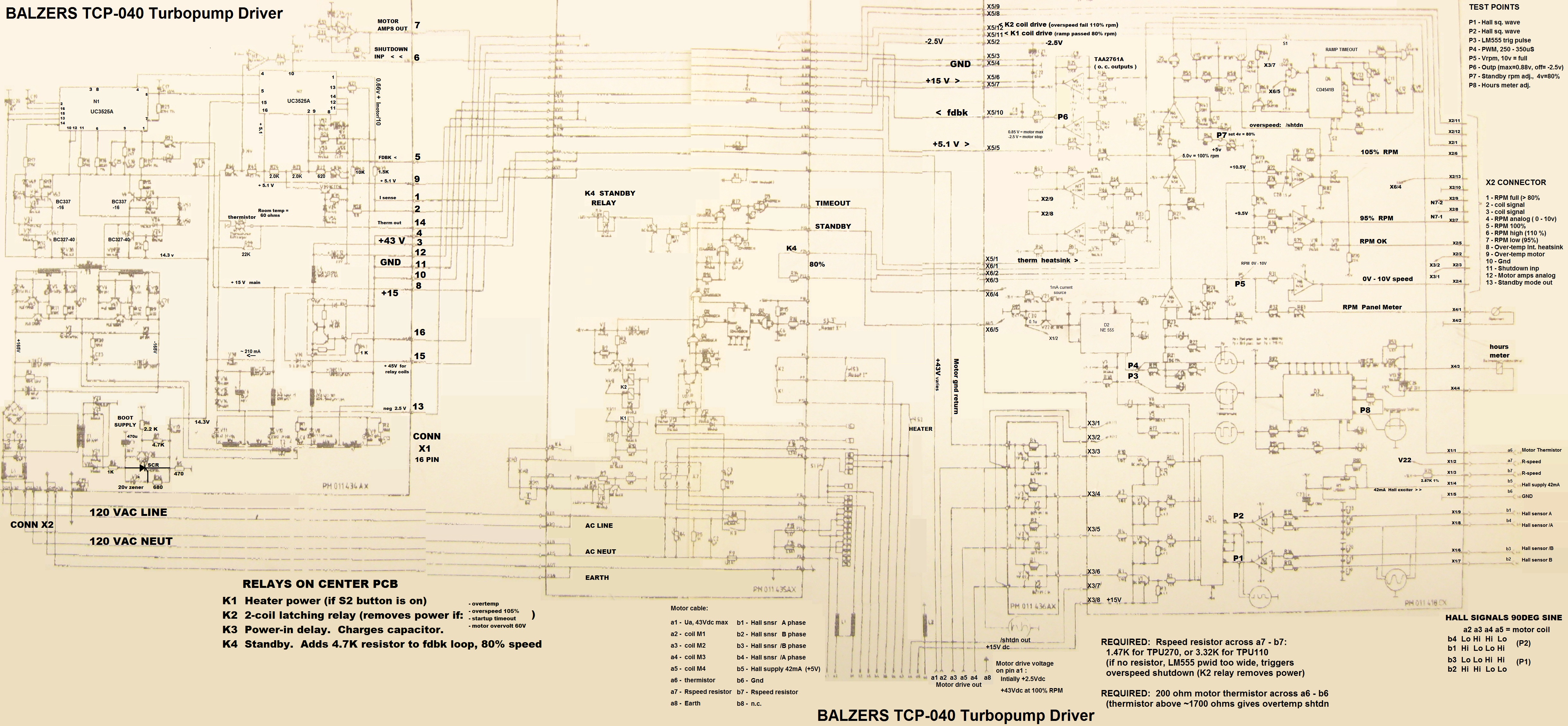 Or, the relays repeatedly click, fan jerks, but only if a turbo pump is connected during power-up: overcurrent detected, PIC626 power transistor is probably shorted or SG3525A is dead, and is applying 45VDC directly to the non-spinning turbo (turbo coils normally start up at 1.5VDC, slowly rise to 35VDC giving 1KHz 60kRPM, or 24VDC for "standby" 700Hz.